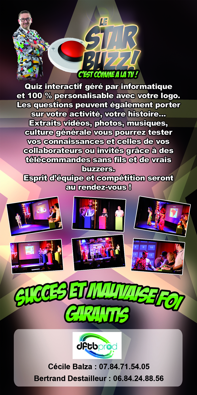 Répondez aux questions de notre animateur avec des télécommandes sans fils et de vrais buzzers. Le tout sur écran géant !
